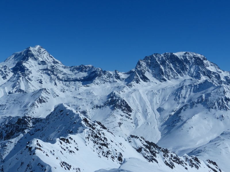 Für vier Tage zog es uns in das für uns unbekannte Unterwallis, genauer gesagt nach Bourg-St-Pierre, der letzte Ort vor dem Pass und Tunnel des Grossen St. Bernhard. Im Hotel Crêt in Bourg-St-Pierre übernachteten wir und schlugen uns morgens und abends auch die Bäuche voll. Der Wetterbericht prophezeite für diese vier Tage bombastisches Wetter. Die erste Skitour führte uns vom Parkplatz vor dem Tunnel des Grossen St. Bernhards zur Combe de Drône, ein Seitental im Südwesten. In gleichmässiger nicht allzu steiler Steigung stiegen wir Schritt für Schritt ins Tal hinein und zugleich dem Gipfel entgegen. Kurz vor dem Gipfel musste ein Skidepot errichtet werden, um die Paar steileren Meter noch zu Fuss zurückzulegen. Die Sicht war atemberaubend, allen vor allem das zum Anfassen nahe Mont Blanc Gebiet sowie Grand Combin, Mont Vélan usw. Schwierigkeit: WS.
