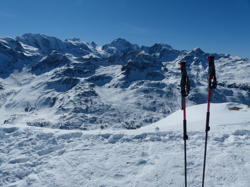 Mit der Berninabahn fuhren wir auf den Berninapass und stiegen bei der Haltestelle Bernina Suot aus. Durch das Val da Fain wanderten wir mit den Skiern an den Füssen nordseitig um den Piz Alv herum. Denn wir starteten unsere Tour westlich vom Piz Alv und der Piz Alv liess sich für uns nur von Osten her erklimmen. Das Gelände im Val da Fain war sehr flach und so war es nicht erstaunlich, dess es erst kurz vor dem Gipfel abwechslungsreich wurde. Die Aussicht auf Piz Palü, Piz Bernina, Piz Morteratsch, etc. waren fantastisch. Für die Abfahrt wählten wir dieselbe Route durch das Val da Fain, jedoch auf der anderen Seite des Baches als beim Aufstieg. Schwierigkeit: WS.